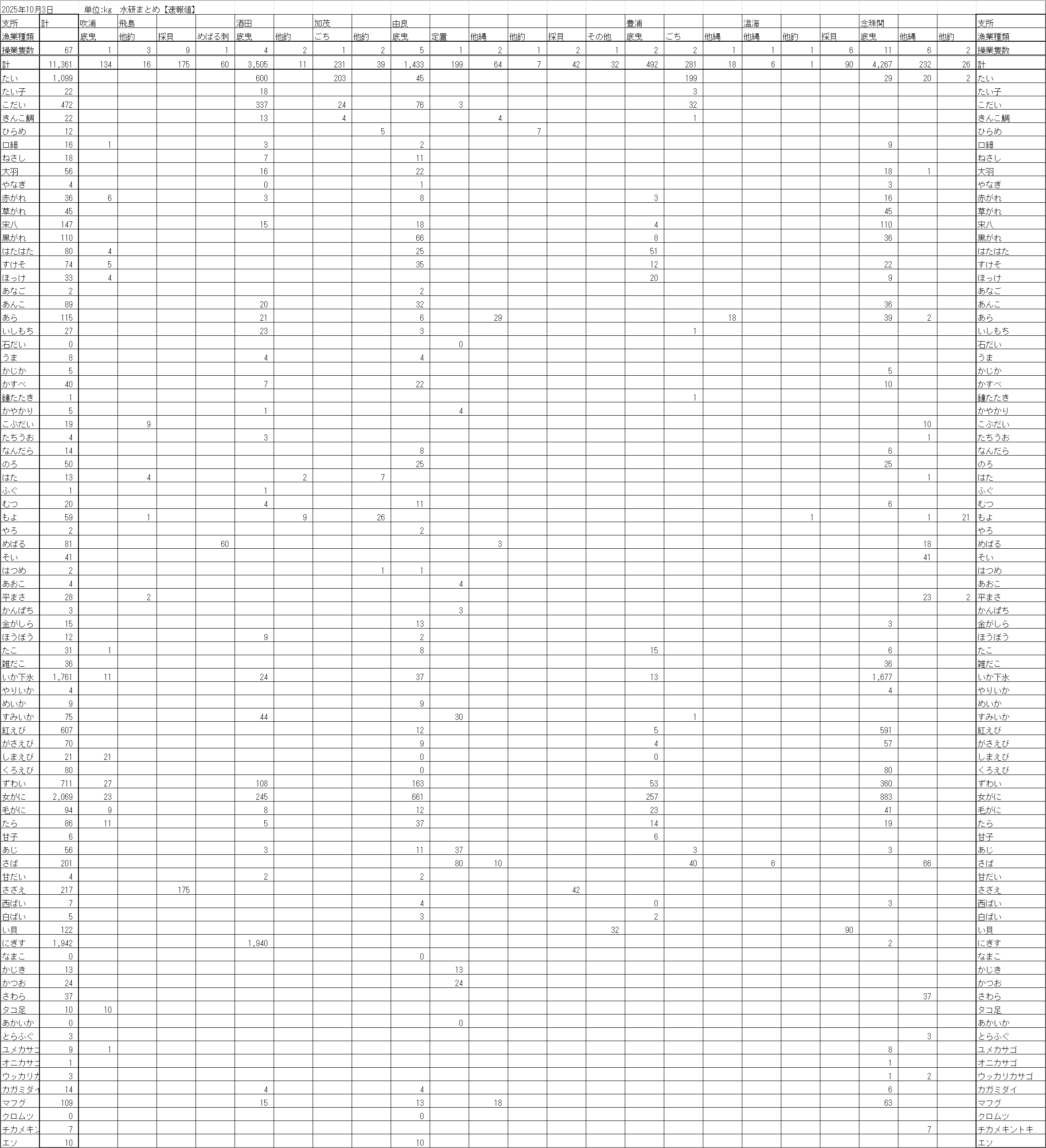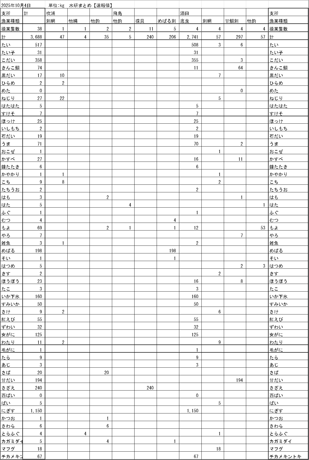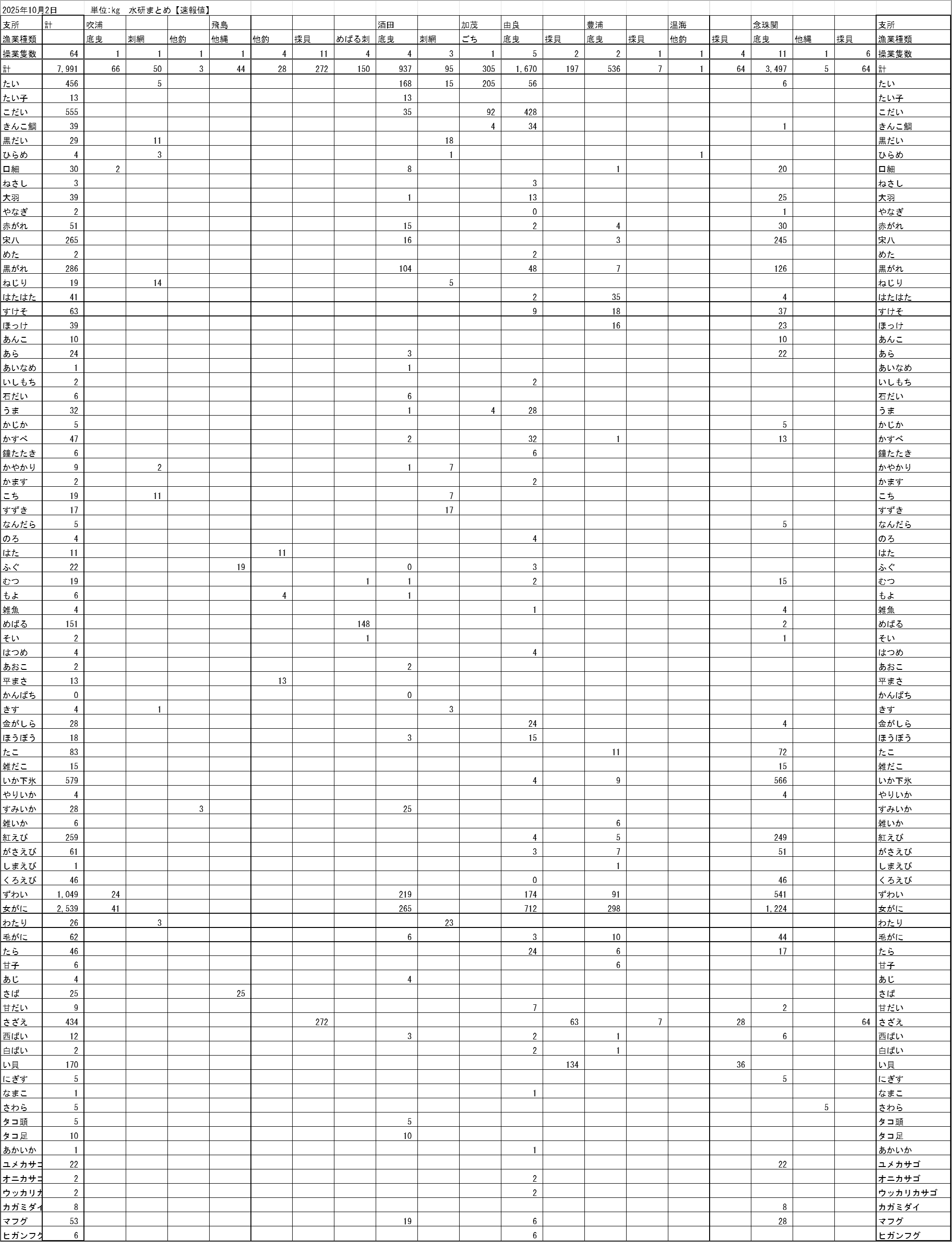 最近の庄内浜各地の水揚げ状況を、支所別・漁業種類別・魚種別に表示しています。