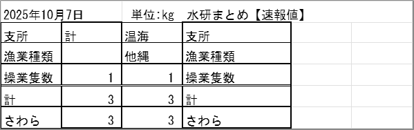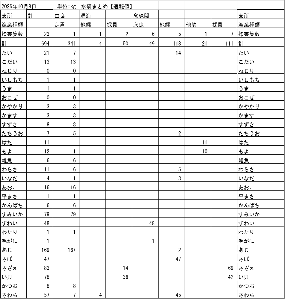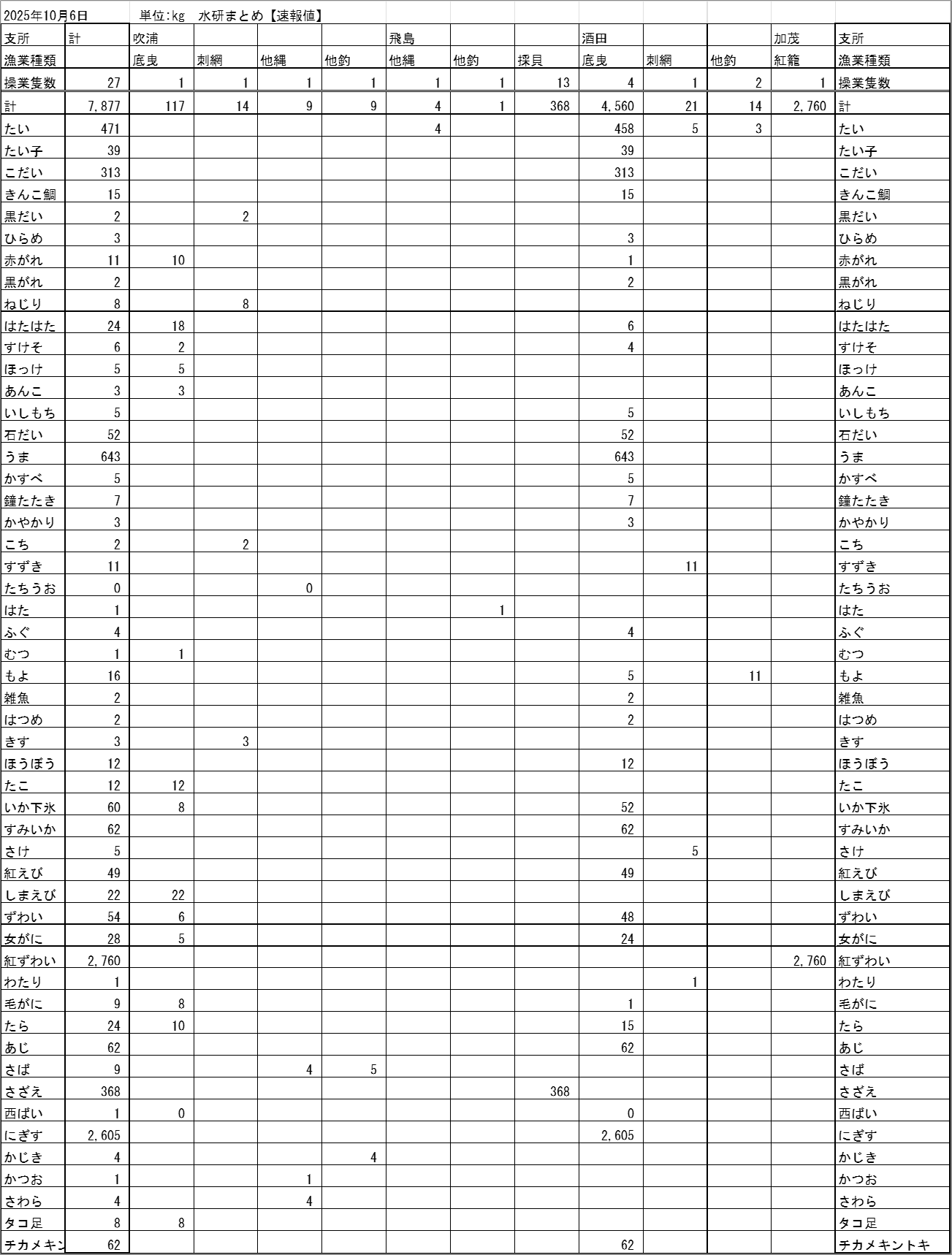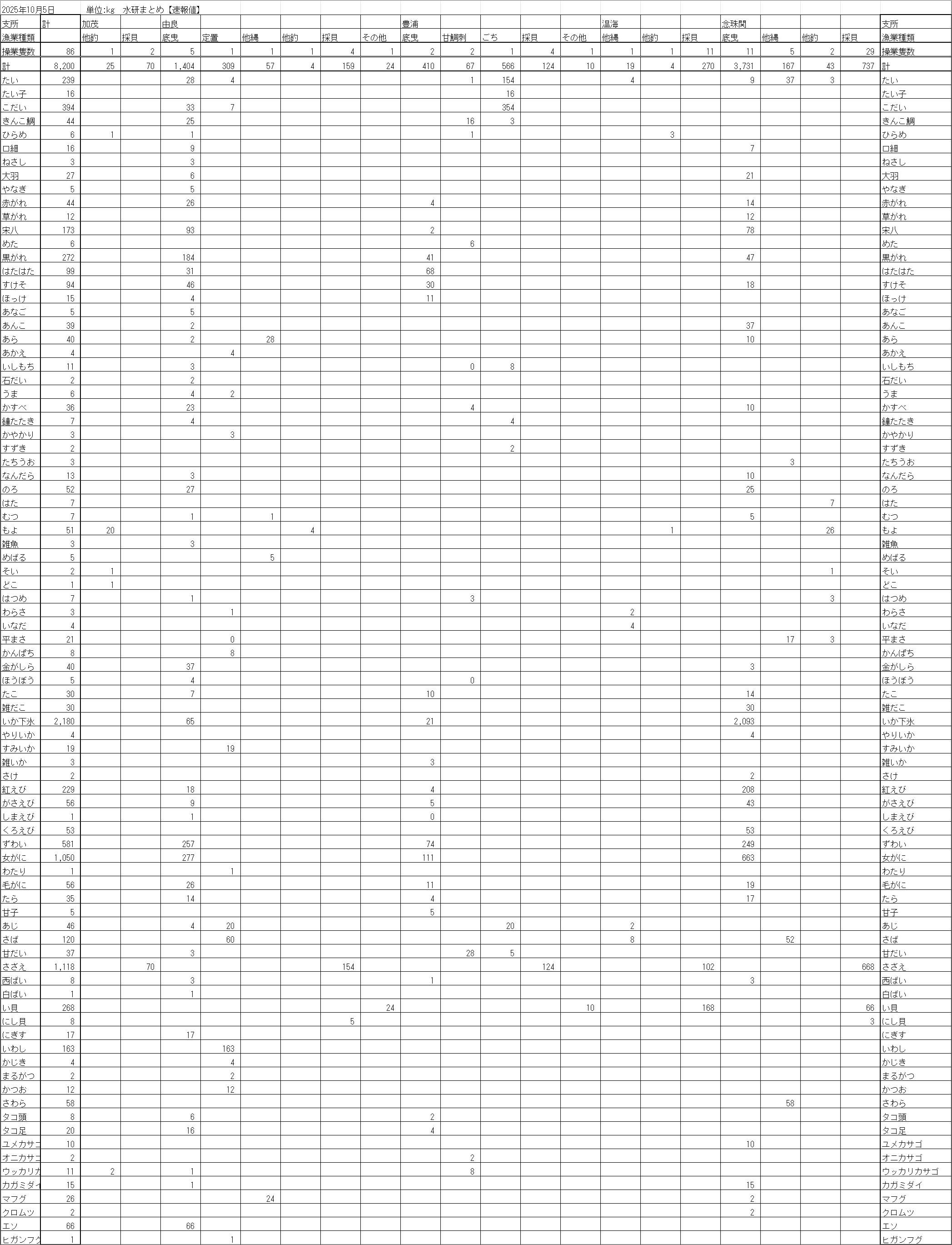 最近の庄内浜各地の水揚げ状況を、支所別・漁業種類別・魚種別に表示しています。